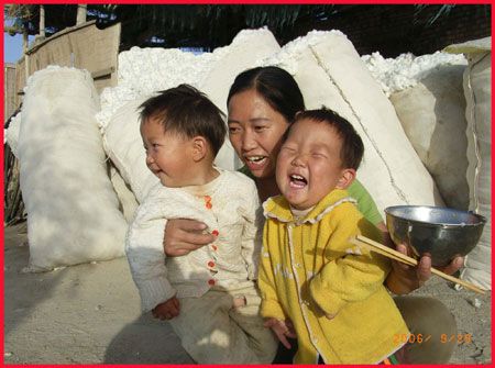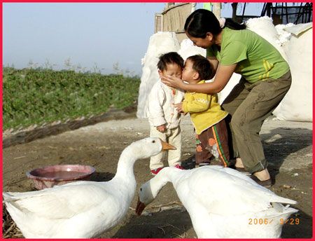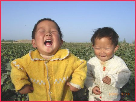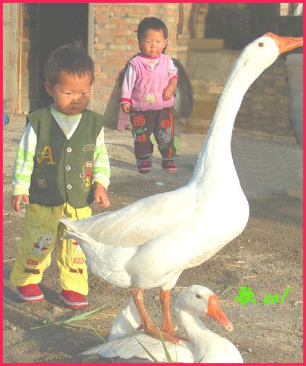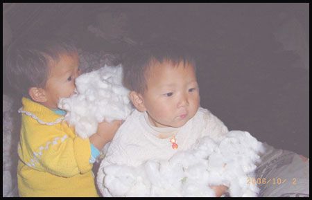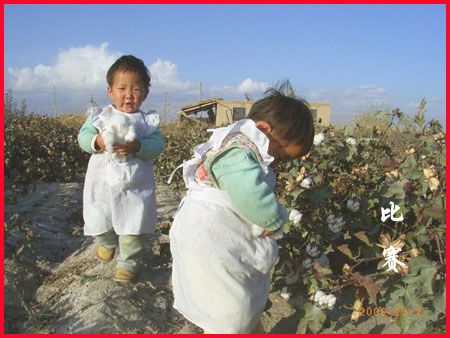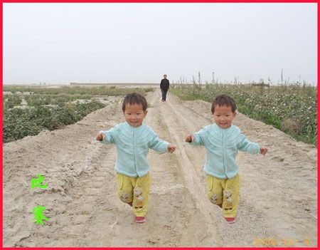 說起兩個女兒,真的非常可愛,大大叫白文,二二叫白靜。倆小家伙,一口一聲奶奶,樂得我答應(yīng)不過來,只要一見他們,再累再疲憊都有了精神。這里沒有大街,他們沒有幼兒園孩子的那些玩具,一人有一個裝10斤飲料的白色塑料桶,有時拖著當(dāng)火車汽車開,有時用繩子拉起大聲叫賣,你追我趕跑得歡。這里沒有小朋友,一對白鵝是玩伙伴。這里天高地寬,房前是盛開的棉花,他們會說的第一個詞不是爸爸媽媽,是“棉棉”,我喜歡他們在棉地里比賽,細(xì)細(xì)觀賞肉溜溜的小手摘下一朵棉花,一邊往圍裙荷包裝,一邊依依牙牙的稚氣聲“棉棉”“多多”,天真的笑臉多讓人愛憐。這里的太陽大,他倆頑皮不怕曬,紅紅的小臉,嫩嫩的皮脫了一層又層。這里的水養(yǎng)更是人,瓊娃子都說,怪怪的哈,女兒一來到這里就喝涼水,從來不拉肚子。
