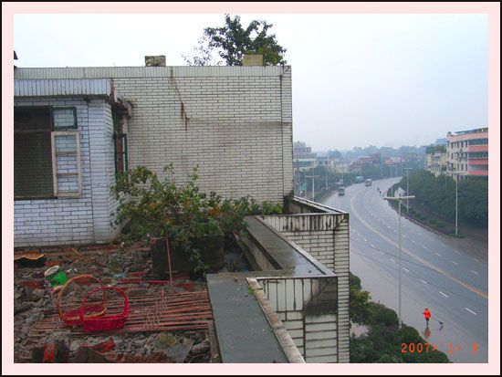 一陣陣震耳欲聾的咚咚咚,促使我走到樓道口看個究竟,民工正用大鐵錘打樓梯,一樓的水泥梯只剩下稀疏的鋼筋,我不說謊無論如何是上不去“拜托你們嘛,我是樓上的住戶,要上去看最后一眼”果然有有效,他們理解我的心情,兩個民工兄弟把我牽過險區(qū),一再囑咐注意安全,他們說,趁現(xiàn)在負(fù)責(zé)施工的頭兒沒在,你要快點下來哈。我小心翼翼上房頂,從不同的角度,拍下了幾張圖片。