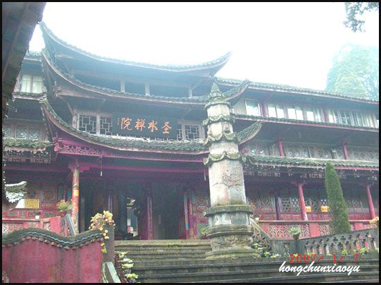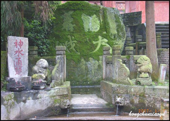 從有關(guān)資料查獲:圣水閣。明萬(wàn)歷末為“神水庵”,清初為“圣水閣”,也稱(chēng)“神水閣”。只見(jiàn)閣下路邊有一小池,池邊有一巨石,上面鐫有“大峨”“福壽”四個(gè)字,果然,泉水從巨石下溢出,兩注流水從池中的小眼里流出,池邊立有一牌子“神水通楚”,還有供香的盆。人們?nèi)∈ニ欢ㄊ窃谶@里。上得幾步石階,在圣水禪院大門(mén)前,矗立一尊高6米的六層石塔。傳說(shuō)是隋朝時(shí)期,智凱大師的衣缽塔。智凱大師曾住中峰寺,常來(lái)此飲神水。后來(lái)他到湖北荊門(mén)玉泉寺住持,時(shí)常思念峨眉山的神水而不可得。一天他在參禪入定時(shí),見(jiàn)一老人自稱(chēng)龍王,他說(shuō)玉泉與峨眉山的神水相通,愿為他引來(lái)神水。智凱說(shuō):“我的缽盂錫杖尚寄在中峰寺內(nèi),如能隨水而來(lái),我就相信!庇谑驱埻豕嬉±徴榷鲇袢纯。也是“神水通楚”的傳說(shuō)。