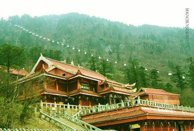 這里山巒澗壑,地形險要,一條陡峭崎嶇的山道通向金頂,有12華里路程。原名叫“接引庵”,在1917年毀于火災(zāi)以后,全寺僧眾竭力營造重建,又于1953年的一場秋火毀于一旦。現(xiàn)在我們所見右側(cè)紅墻翹檐的“文殊寶殿”,是近年在“接引庵”舊址上重新修建的。在垂直高度431米(這里海拔2646米與金頂3077米之差)的弓背山之間,凌空飛架3條索道,我們將乘左邊的客運專線,右邊是剛剛建成的客運線,那一輛輛精美的小型觀光車包廂,像串聯(lián)的一個個小小搖籃,又像繽紛的團團云霞一樣,飛舞在青峰翠壑之間。