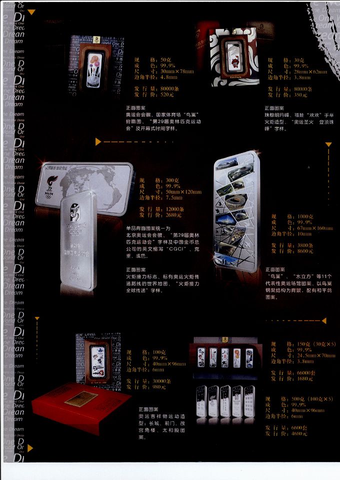 奧運(yùn)彩色銀條共七種規(guī)格,分30克、50克、100克、300克、1000克單品和500克、1500克套裝,涵蓋會(huì)徽、場(chǎng)館、吉祥物、開幕式、火炬接力標(biāo)志性?shī)W運(yùn)元素,禮品、收藏兩相宜。