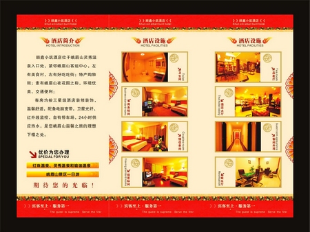 您好:以上價(jià)格為參考價(jià)格。具體價(jià)格根據(jù)具體事宜商議決定。請(qǐng)相信我們……我們一直堅(jiān)守誠信為本——顧客至上的原則——我們會(huì)以最優(yōu)惠的價(jià)格給予你最優(yōu)質(zhì)的服務(wù)——相信我們能夠做的更好…… 峨眉王朝銀先生的自家賓館位于報(bào)國寺靈秀溫泉入口處,剛剛裝飾一新,委托我們?yōu)樗O(shè)計(jì)宣傳手冊(cè),要求設(shè)計(jì)精致、印刷精美,價(jià)格低廉。通過我們精心設(shè)計(jì)效果令王先生滿意。
