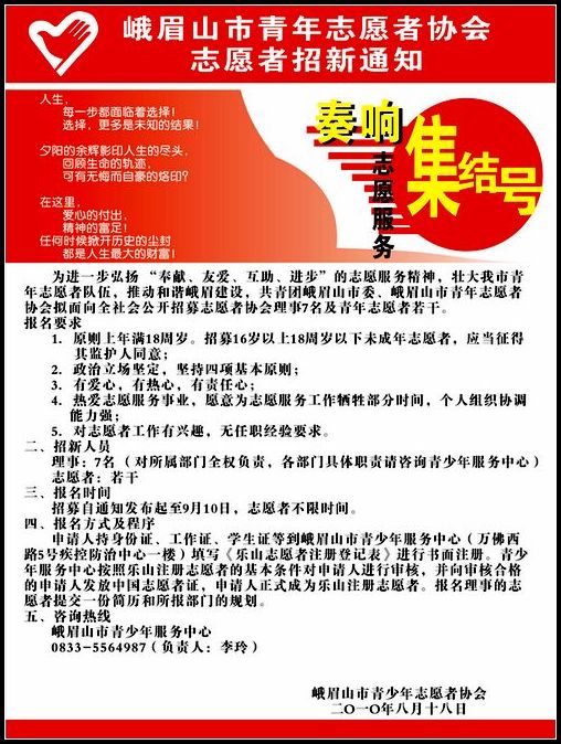 為進一步弘揚 “奉獻、友愛、互助、進步”的志愿服務精神,壯大我市青年志愿者隊伍,推動和諧峨眉建設,共青團峨眉山市委、峨眉山市青年志愿者協(xié)會擬面向全社會公開招募志愿者協(xié)會理事7名及青年志愿者若干。