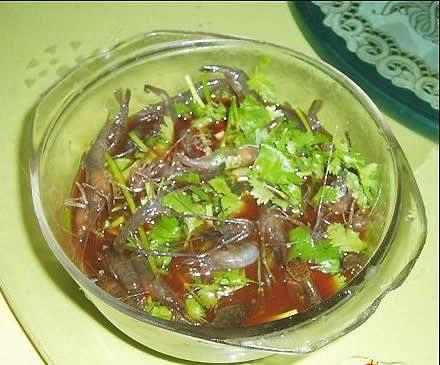 三吱兒:剛出生的小老鼠(活的)一盤,調(diào)料一盤。食用者用筷子夾住活老鼠,老鼠會“吱兒“的叫一聲,(這是第一吱兒),再來將它沾到調(diào)味料時,鼠又會“吱兒“一聲,(這是第二吱兒),當(dāng)放入食用者口中時,鼠發(fā)出最后一“吱兒“(共三吱兒)。菜譜簡單,食用者需要無窮的饕餮動力和無比的勇氣,才可以品嘗這道菜。