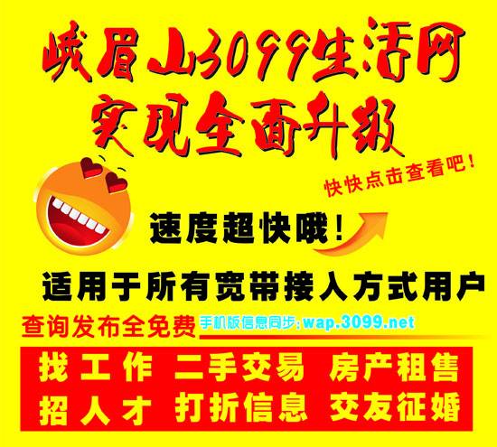 3099峨眉山生活網(wǎng),已經(jīng)全面升級(jí),適合于所有寬帶接入方式用戶。歡迎大家點(diǎn)擊查看。