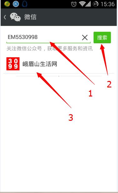 3.輸入公眾賬號,點擊搜索,點擊峨眉山生活網(wǎng)