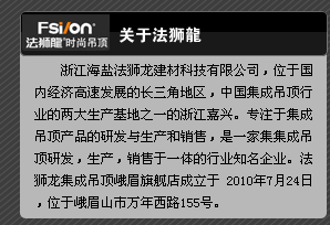 浙江海鹽法獅龍建材科技有限公司,位于國內(nèi)經(jīng)濟(jì)高速發(fā)展的長三角地區(qū),中國集成吊頂行業(yè)的兩大生產(chǎn)基地之一的浙江嘉興。專注于集成吊頂產(chǎn)品的研發(fā)與生產(chǎn)和銷售,是一家集集成吊頂研發(fā),生產(chǎn),銷售于一體的行業(yè)知名企業(yè)。法獅龍集成吊頂峨眉旗艦店成立于2010年7月24日,位于峨眉山市萬年西路155號。