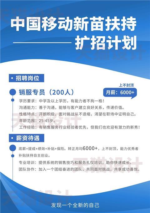 工作內(nèi)容:圍繞移動(dòng)公司的業(yè)務(wù)拜訪沿街商鋪、新舊小區(qū)、農(nóng)村市場、企事業(yè)單位、房屋中介等,推銷并解決用戶網(wǎng)絡(luò)需求(比如:寬帶、號(hào)卡、路由器、流量包等)