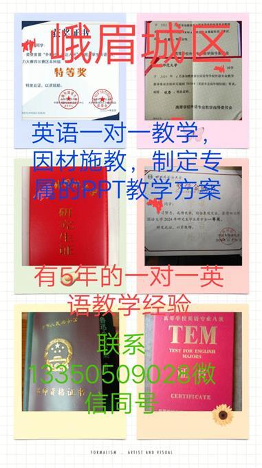 工作經(jīng)歷:本碩都是重點(diǎn)一本師范大學(xué)英語(yǔ)師范專業(yè)的在讀研究生,有在成都5年的一對(duì)一家教經(jīng)歷,有豐富的教學(xué)經(jīng)驗(yàn)和方法,有高級(jí)中學(xué)教師資格證,有全國(guó)英語(yǔ)專業(yè)八級(jí)優(yōu)秀證書,有全國(guó)英語(yǔ)競(jìng)賽獲獎(jiǎng)榮譽(yù)證書等等,高中的時(shí)候是理科生,高考成績(jī)超過(guò)重本線70多分,數(shù)學(xué)英語(yǔ)物理化學(xué)都可以,因材施教原則,根據(jù)個(gè)人情況制定專屬PPT教學(xué)方案,查缺補(bǔ)漏拓展培優(yōu)等等,有需要在寒假期間提升英語(yǔ)成績(jī)的可以聯(lián)系我